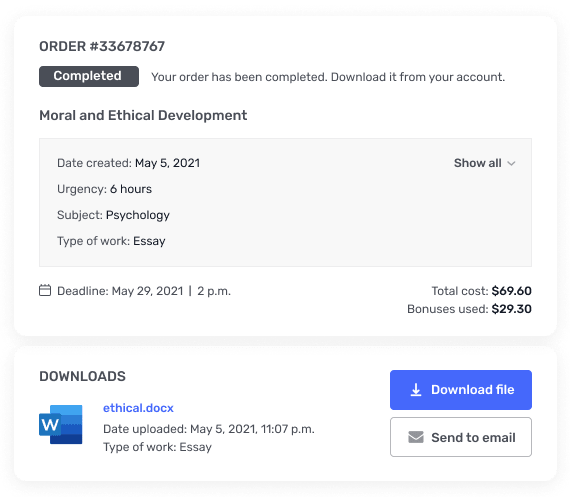 All you need to do is enter your paper guidelines by filling out forms that are quick and simple. Then, our team will assign you a personal essay writer most suitable to handle your task. You’ll receive a message and an email when the writer is assigned and then when it is time for you to download papers.
